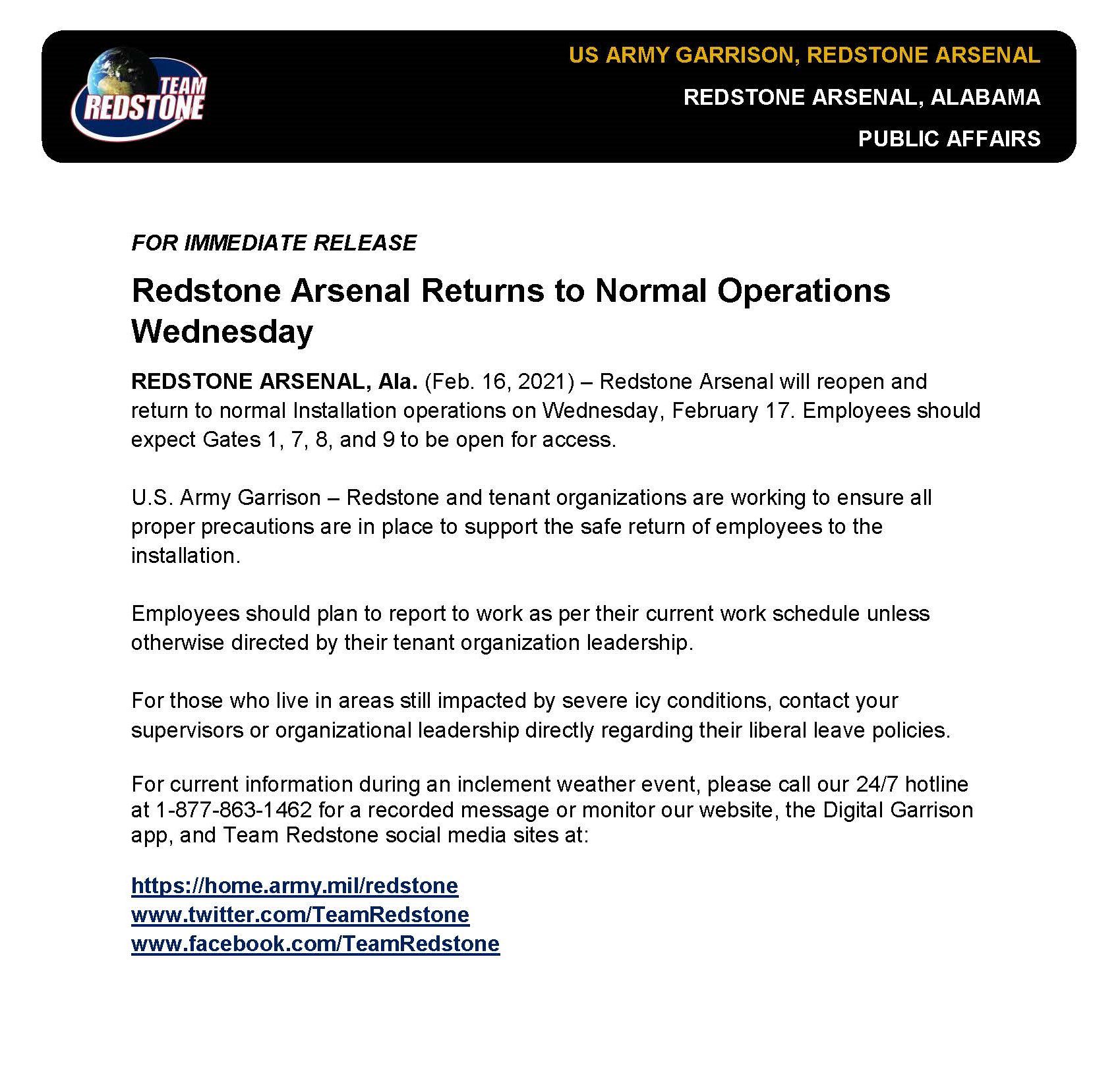 Redstone Arsenal On Twitter Hey Team Redstone Here Is Your Installation Status Update For Wednesday 17 Feb The Installation Will Return To Normal Operations Https T Co Abn79muu7q